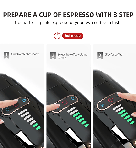 The machine works in hot and cold coffee mode, so you can enjoy hot or cold coffee (note that hot coffee mode takes about 35 seconds to warm up).HiBrew New update of coffee machine: LED light bar indicator light-align the LED and light bar with the light bar on the DG capsule *. Adjust the brewing amount accordingly, and it only takes 1.5 minutes to enjoy a delicious cup of coffee!