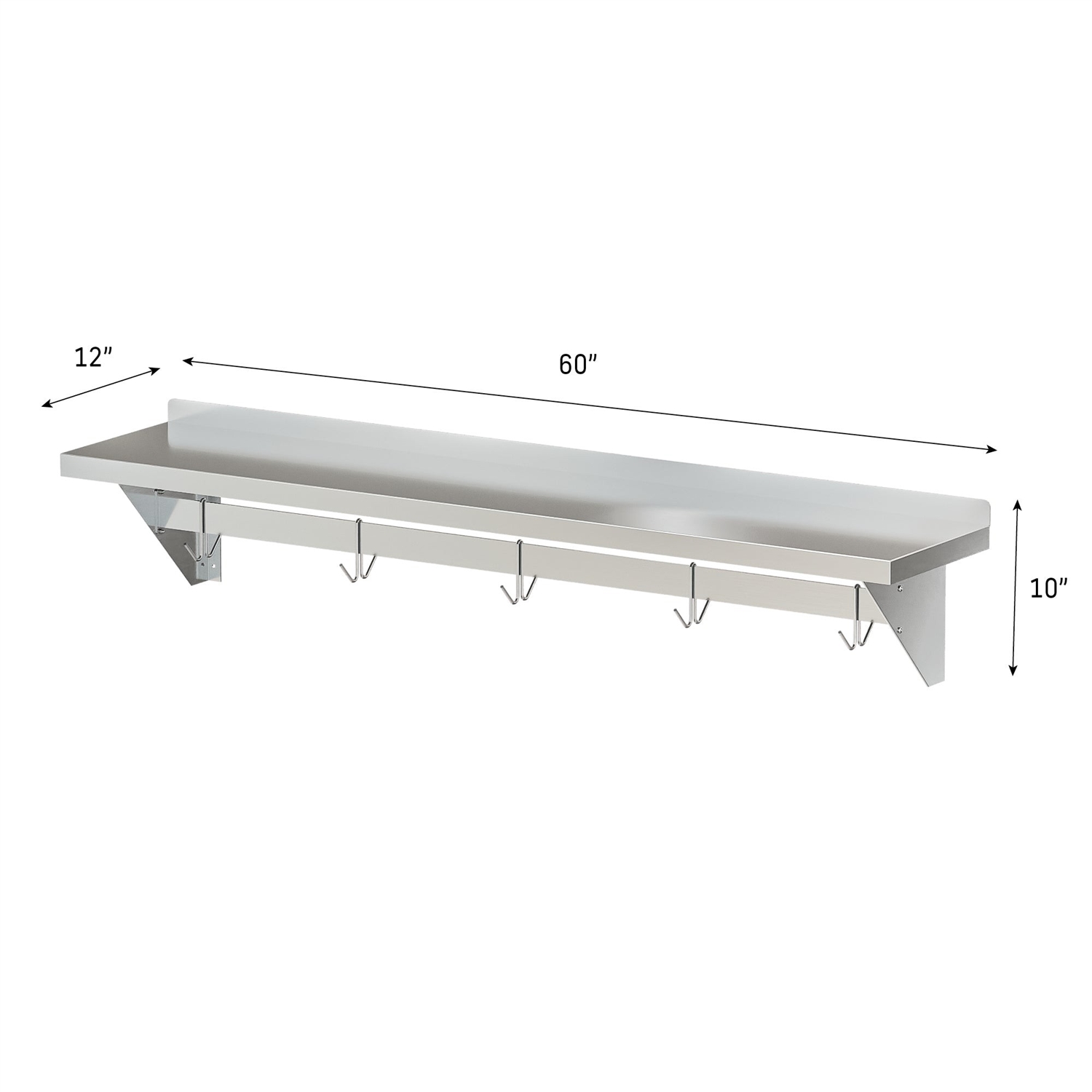 This multipurpose Stainless Steel Heavy Duty Wall Shelf with Pot Rack - 12 inches x 60 inches features a wide shelf on the top, perfect for food prep items, jars, containers, and condiment, as well as 3 hanging hooks on the bottom to hang up pots, pans, utensils, and other kitchen essentials. Comes with step-by-step directions on how to put it together as well as how to mount it on the wall, so you can easily get it mounted up in your kitchen in no time.